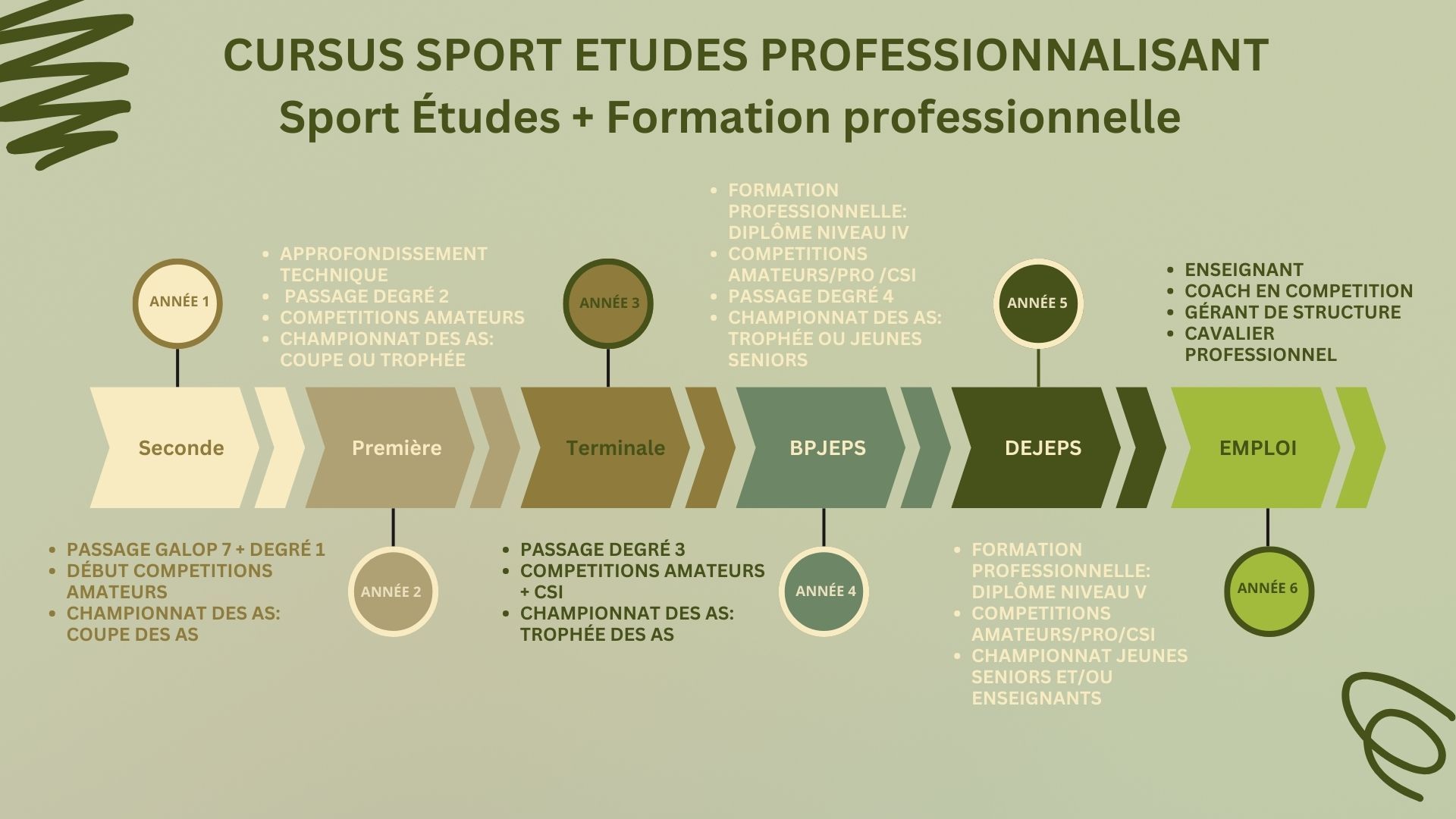 Les trois premières années seront consacrées au perfectionnement technique et la scolarité, ainsi qu'au passage des Degrés (description ci dessous) qui permettent des équivalences pour la deuxième partie du cursus, la formation au BPJEPS et au DEJEPS, afin de libérer du temps pour la poursuite des compétitions vers le haut niveau.